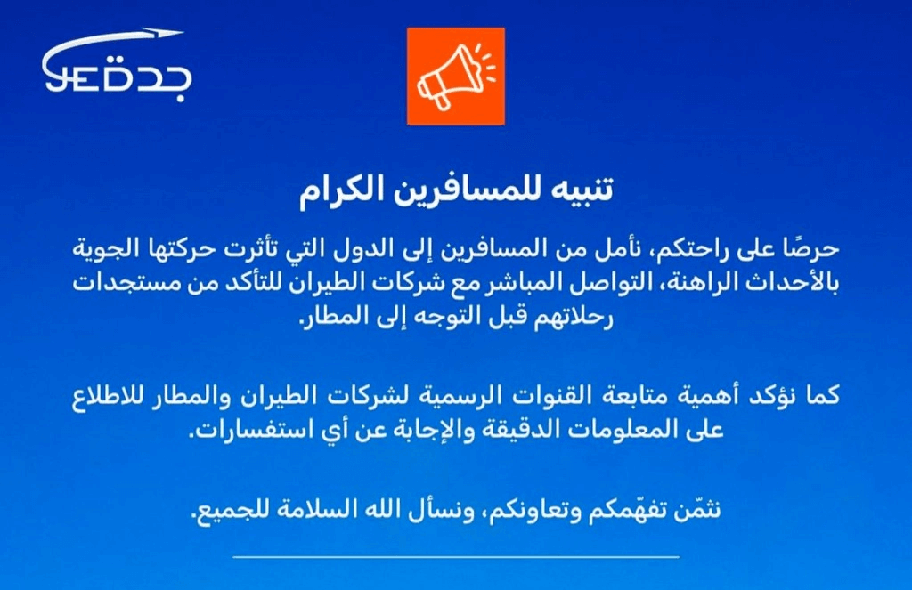 Otoritas Bandara King Abdulaziz Jeddah mengeluarkan peringatan perjalanan kepada seluruh penumpang yang akan terbang dari atau menuju bandara tersebut, menyusul situasi keamanan dan penerbangan yang terganggu akibat eskalasi konflik di kawasan Timur Tengah.